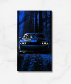 La fuerza bruta americana emerge de la oscuridad. Este cuadro canvas captura la mirada intimidante del Dodge Challenger SRT Hellcat en un entorno natural nocturno. Con un azul profundo y sus emblemáticos faros encendidos, esta pieza transmite potencia y misterio a partes iguales. Un elemento decorativo esencial para fanáticos de Mopar y los motores de alto rendimiento que buscan un estilo audaz.