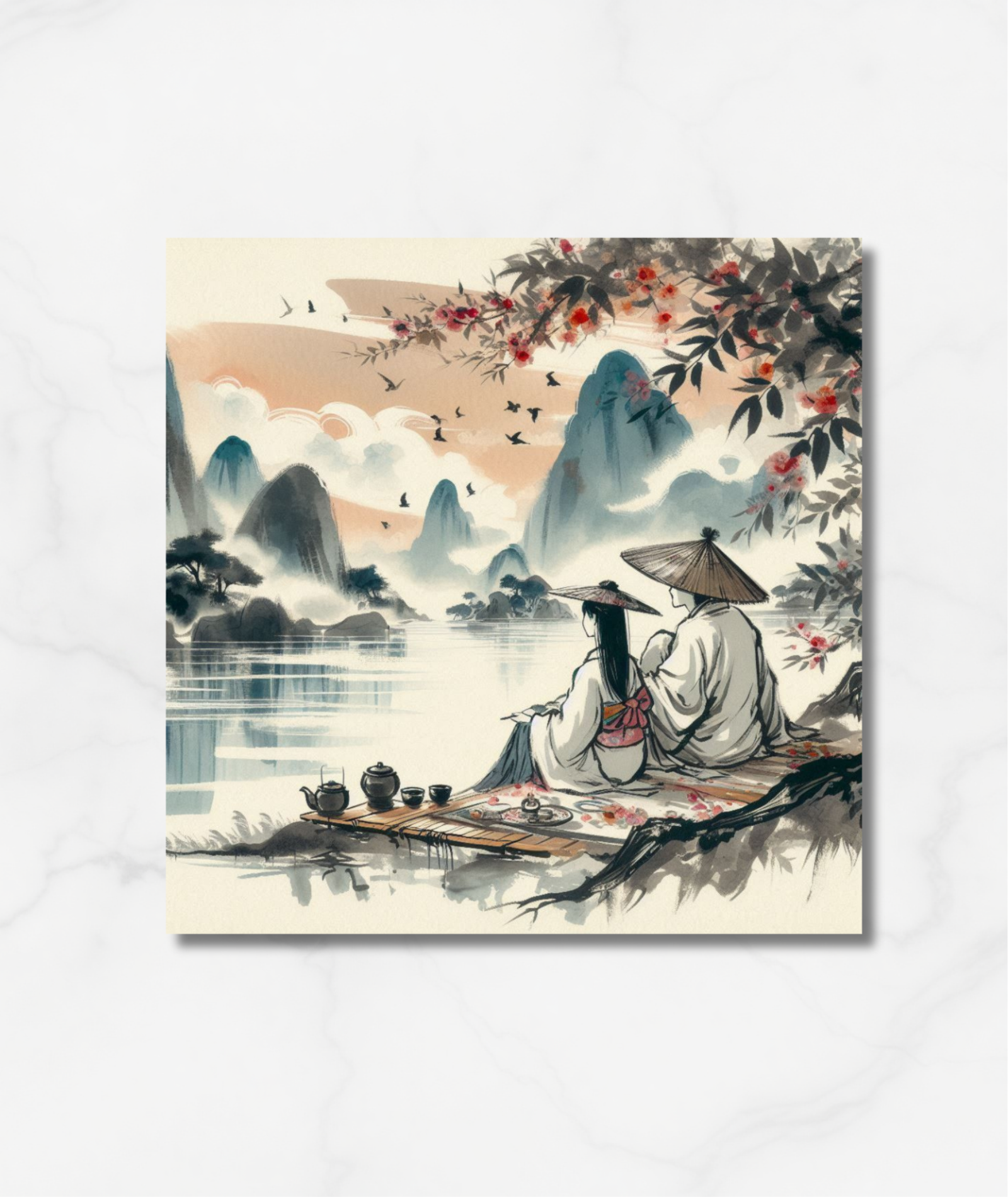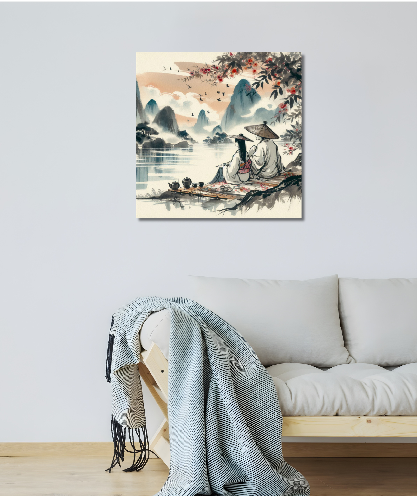 Cuadro estilo asiático cuadrado de paisaje montañoso con una pareja de enamorados.