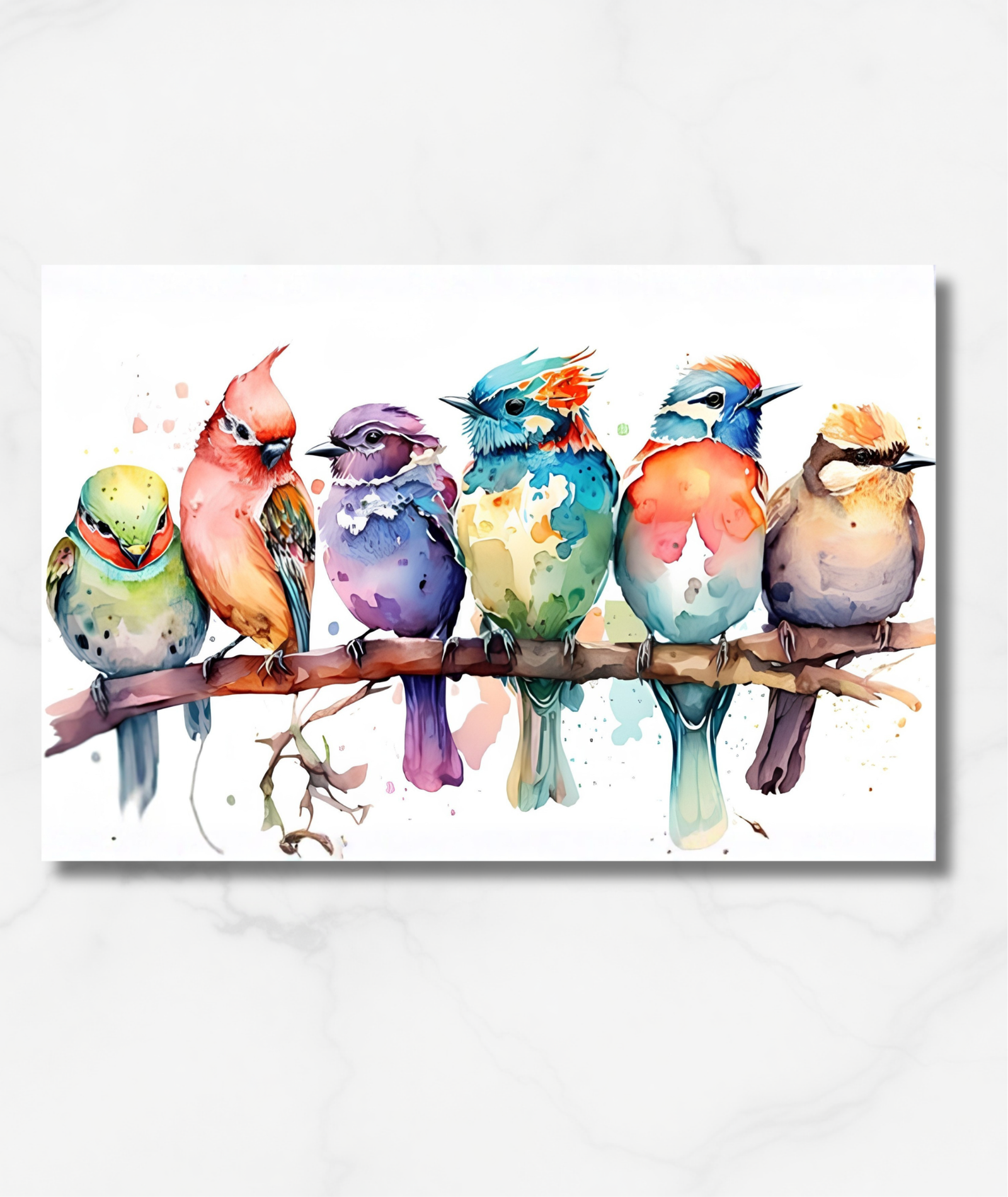 Cuadro de varios pajaritos en una rama.