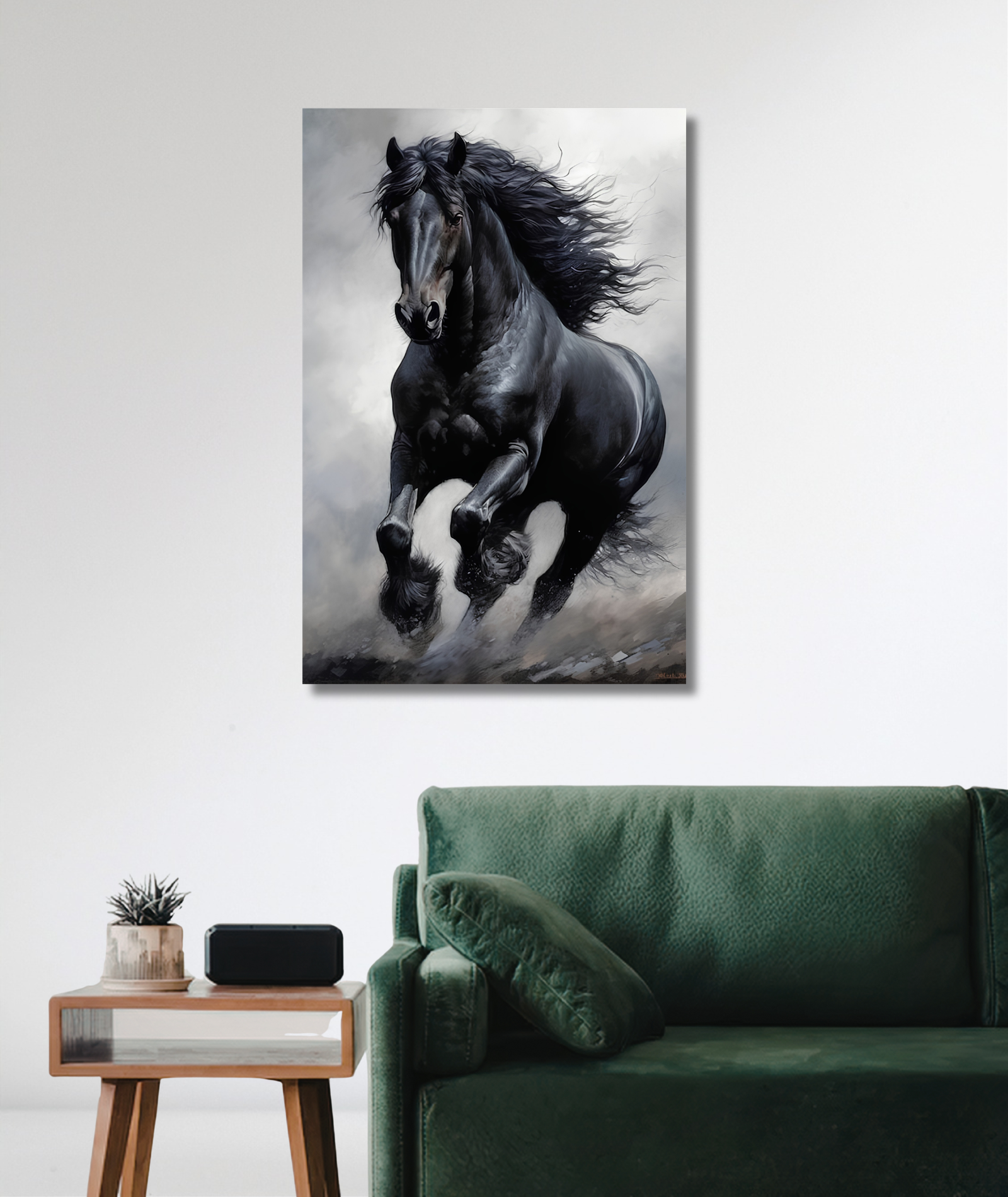 Impactante cuadro de corcel indomable color negro, impreso en canvas. Representa fuerza, libertad y energía. Ideal para living u oficina. Envíos a todo Chile.