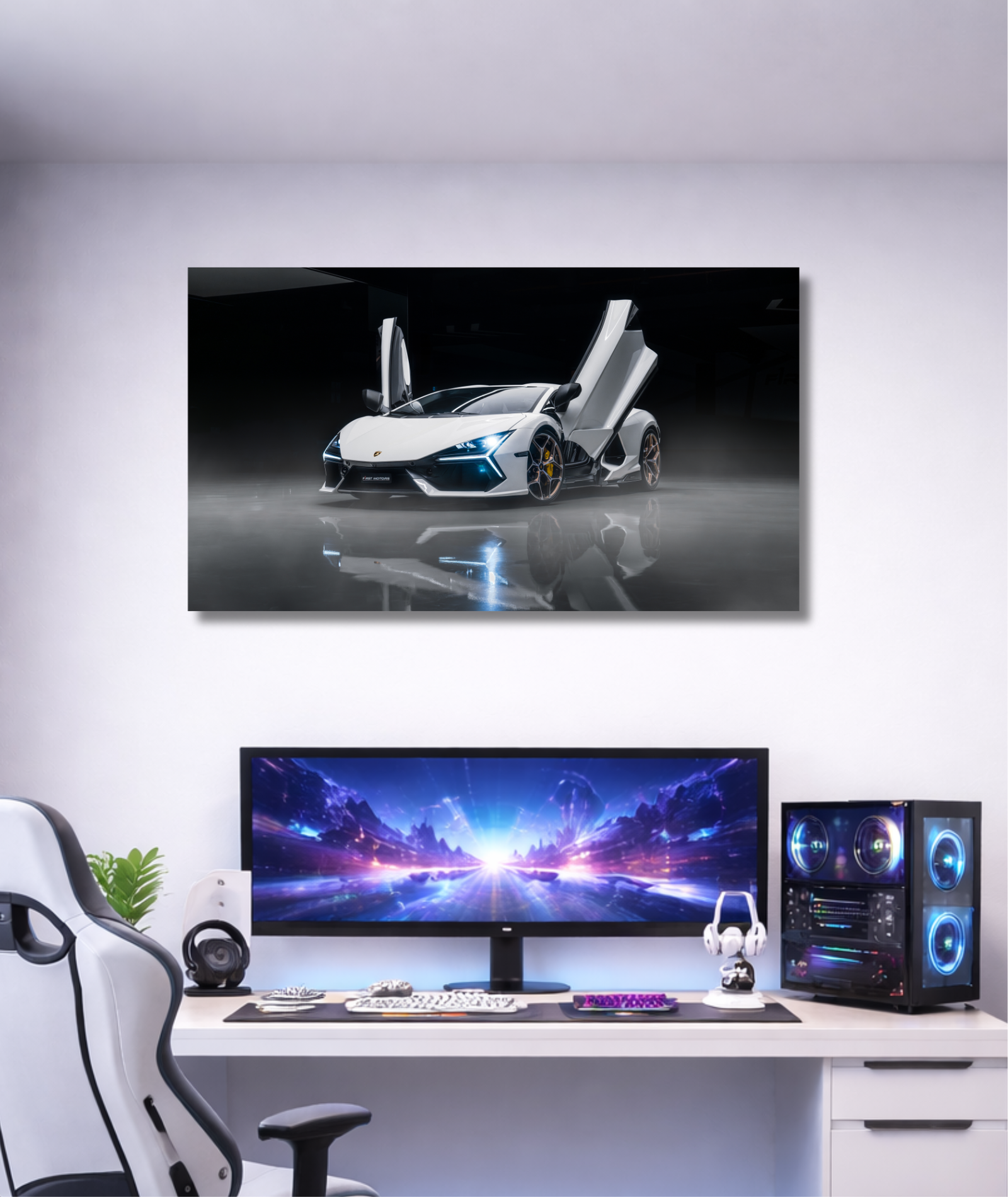 El Lamborghini Revuelto ha llegado para redefinir el concepto de superdeportivo, y ahora puedes tenerlo en tu colección personal. Este cuadro decorativo captura la esencia del nuevo V12 híbrido, resaltando sus líneas futuristas, su firma lumínica en “Y” y la elegancia del blanco en contraste con un entorno minimalista. Es la representación máxima del lujo automotriz contemporáneo.