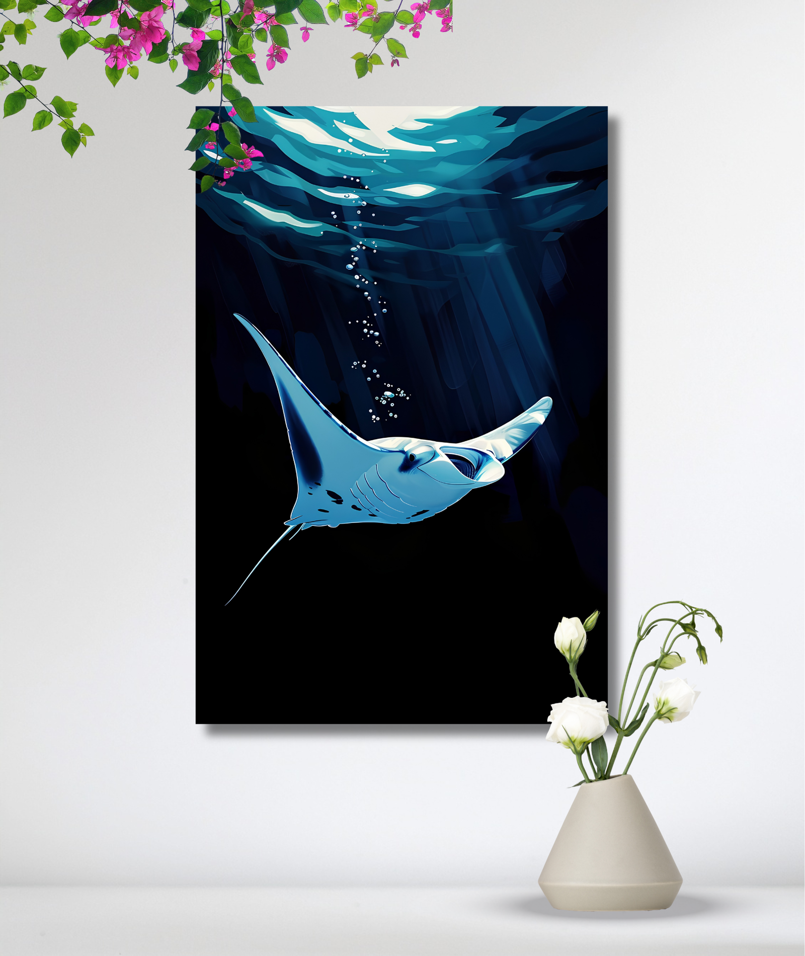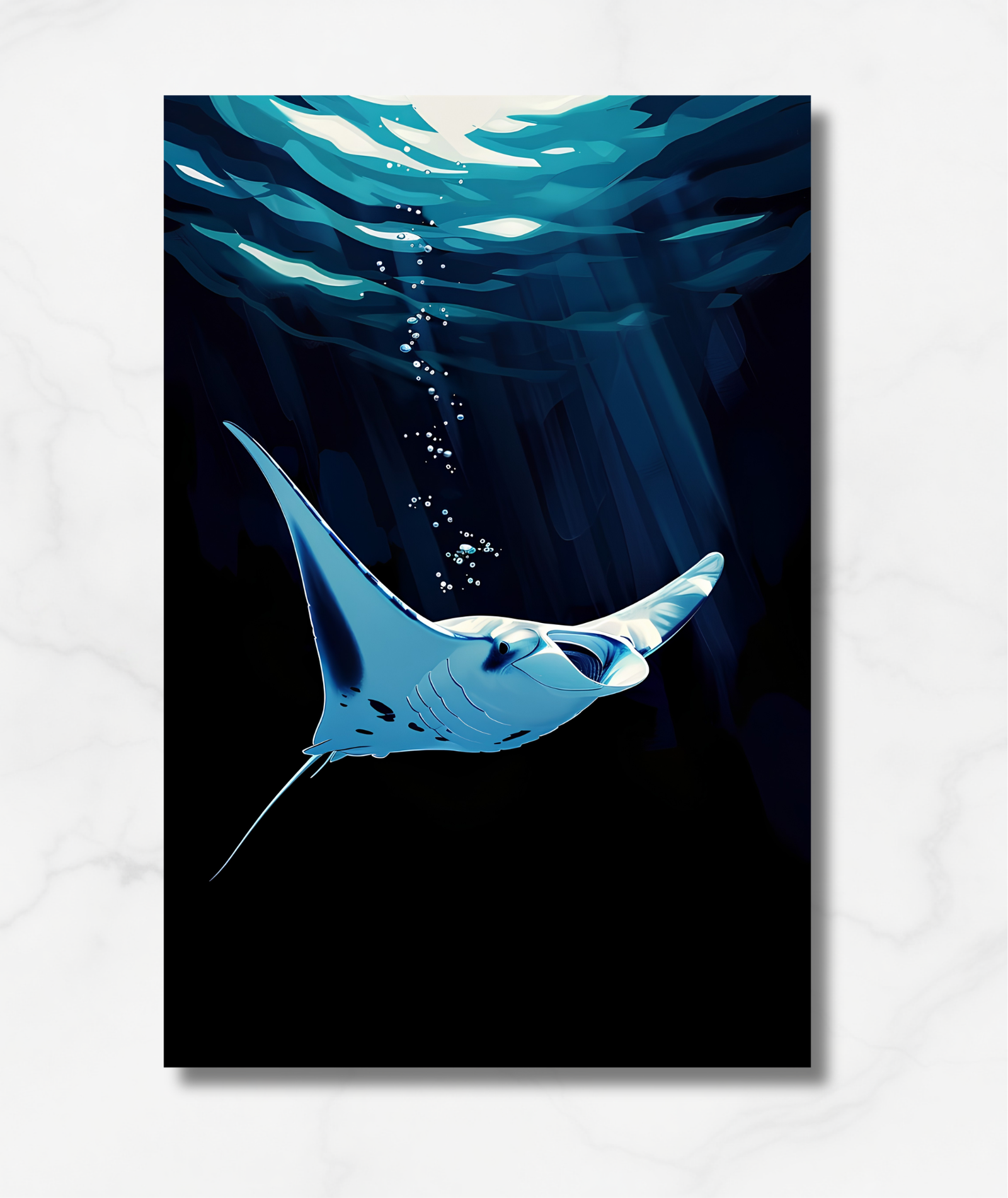 Cuadro de dos mantarrayas nadando en la oscuridad.